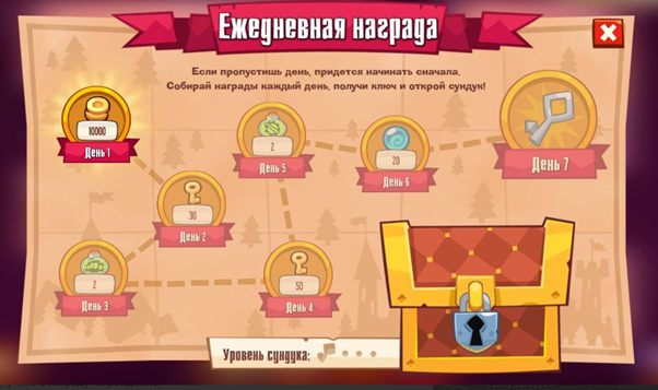 Если пропустить один день, неделя начнётся сначала. Собирайте награды каждый день, чтобы получить ключ и открыть замок! Всего у сундука может быть до 4 замков.